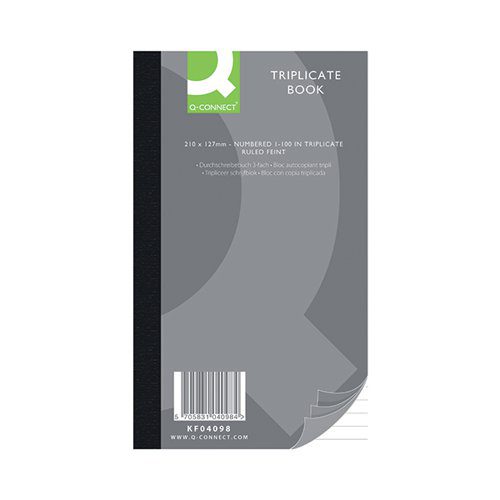 Create copies in triplicate with this durable tape bound book. The book is numbered 1-100 in triplicate with a feint ruled top copy and plain backing pages for neat receipts and more. It also features an index at the front for easy reference. Ideal for retail, petty cash records and more, this book measures 210 x 127mm (8 x 5 inches). It comes with four sheets of carbon paper